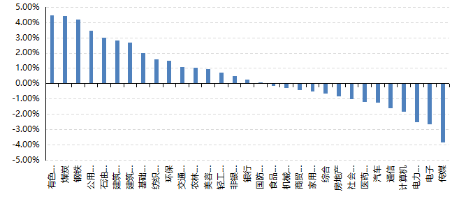 31個申萬一級行業(yè)中有17個行業(yè)上漲。其中,有色金屬、煤炭、鋼鐵表現(xiàn)居前,漲跌幅分別為4.44%、4.41%、4.18%,電力設備、電子、傳媒表現(xiàn)居后,漲跌幅分別為-2.52%、-2.63%、-3.83%。