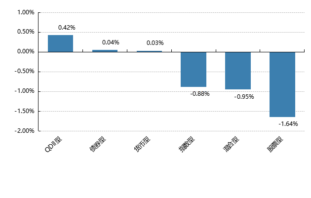 上周,國內(nèi)權益基金漲跌不一,其中QDII型基金平均上漲0.42%,混合型和股票型基金平均下跌0.95%和1.64%。